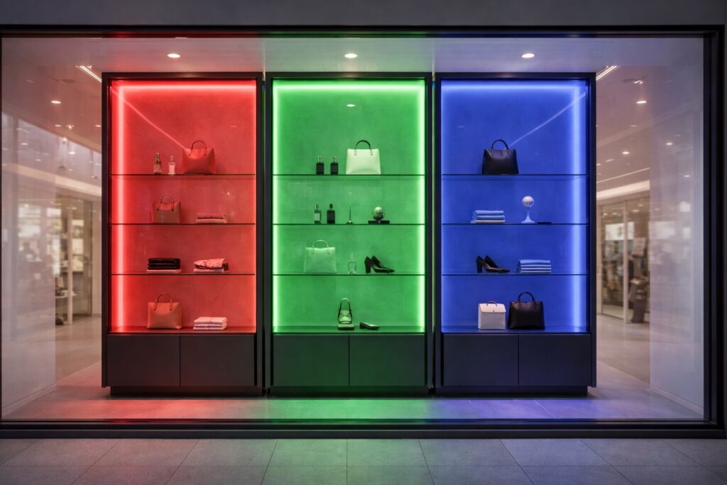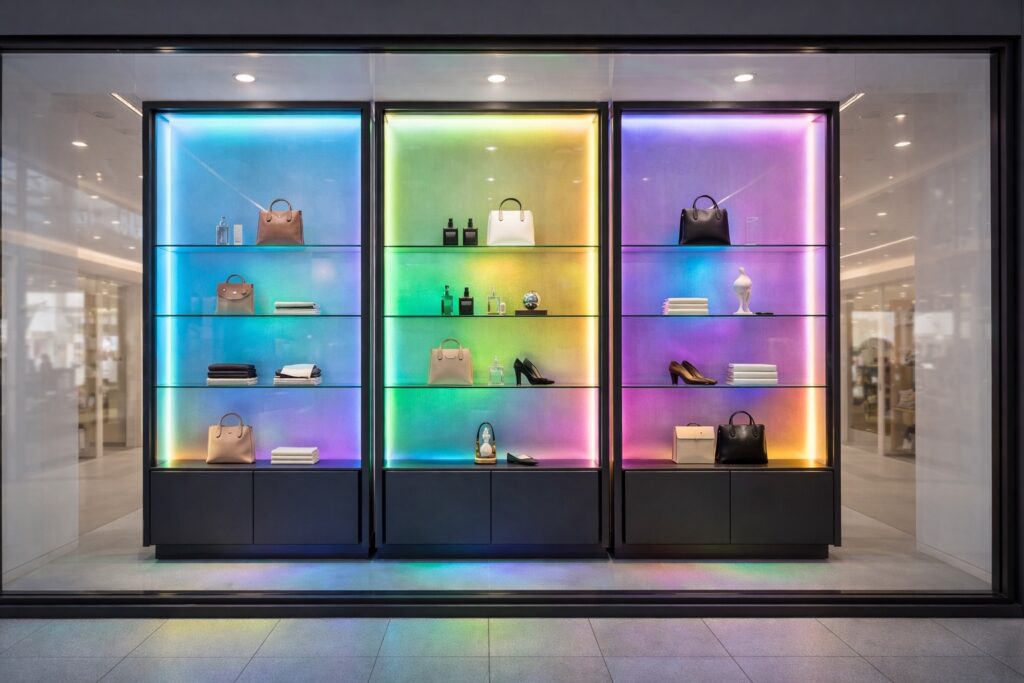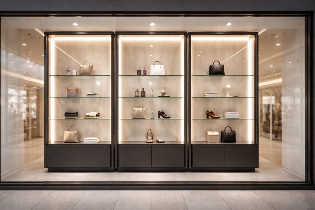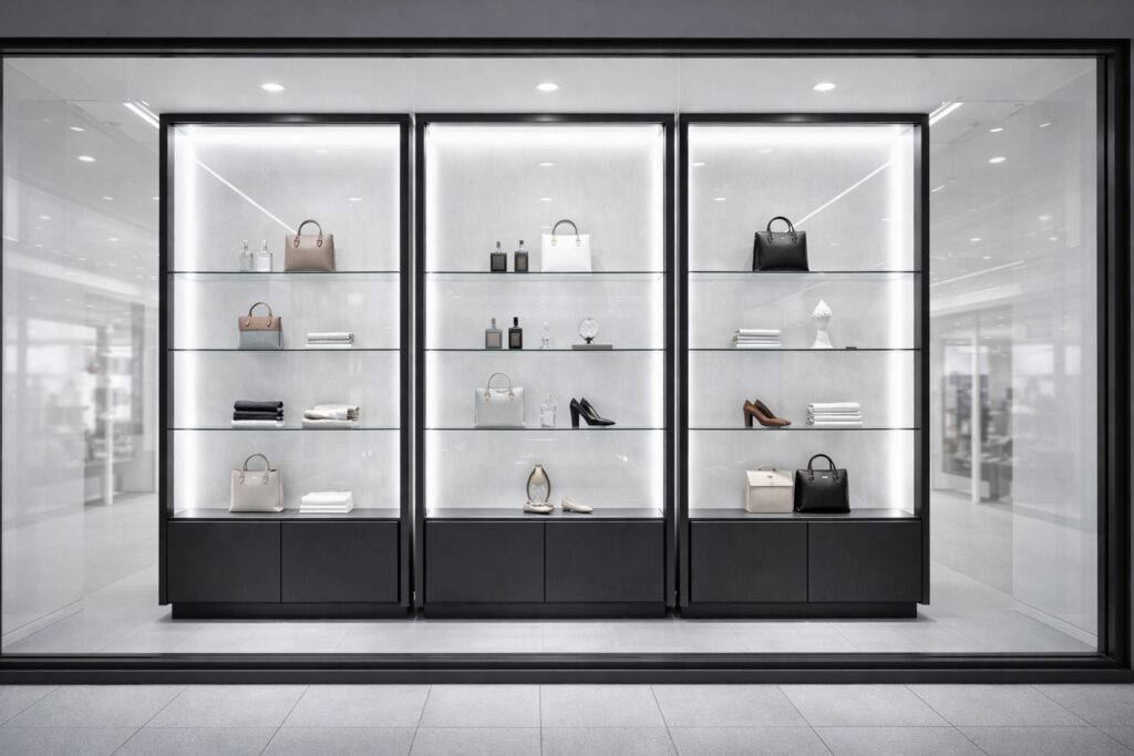Boutiques, jewellery stores, dealer showrooms and reception displays requiring refined lighting control, clean sightlines and consistent presentation standards.