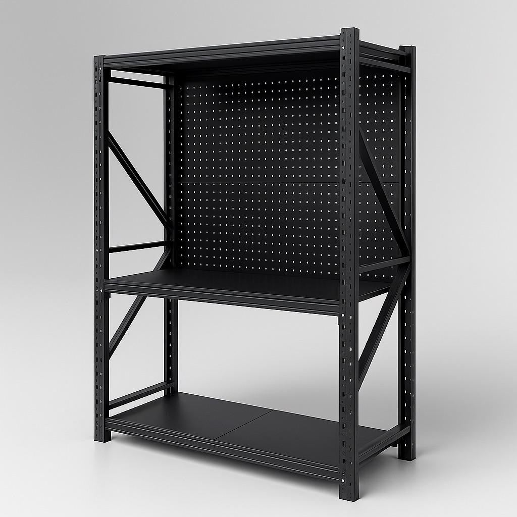 Introducing our 3-Level Steel Shelving with Pegboard, featuring a modern black square-hole back panel. This unit combines strength, flexibility, and style — the perfect solution for keeping your garage, workshop, or warehouse clutter-free.